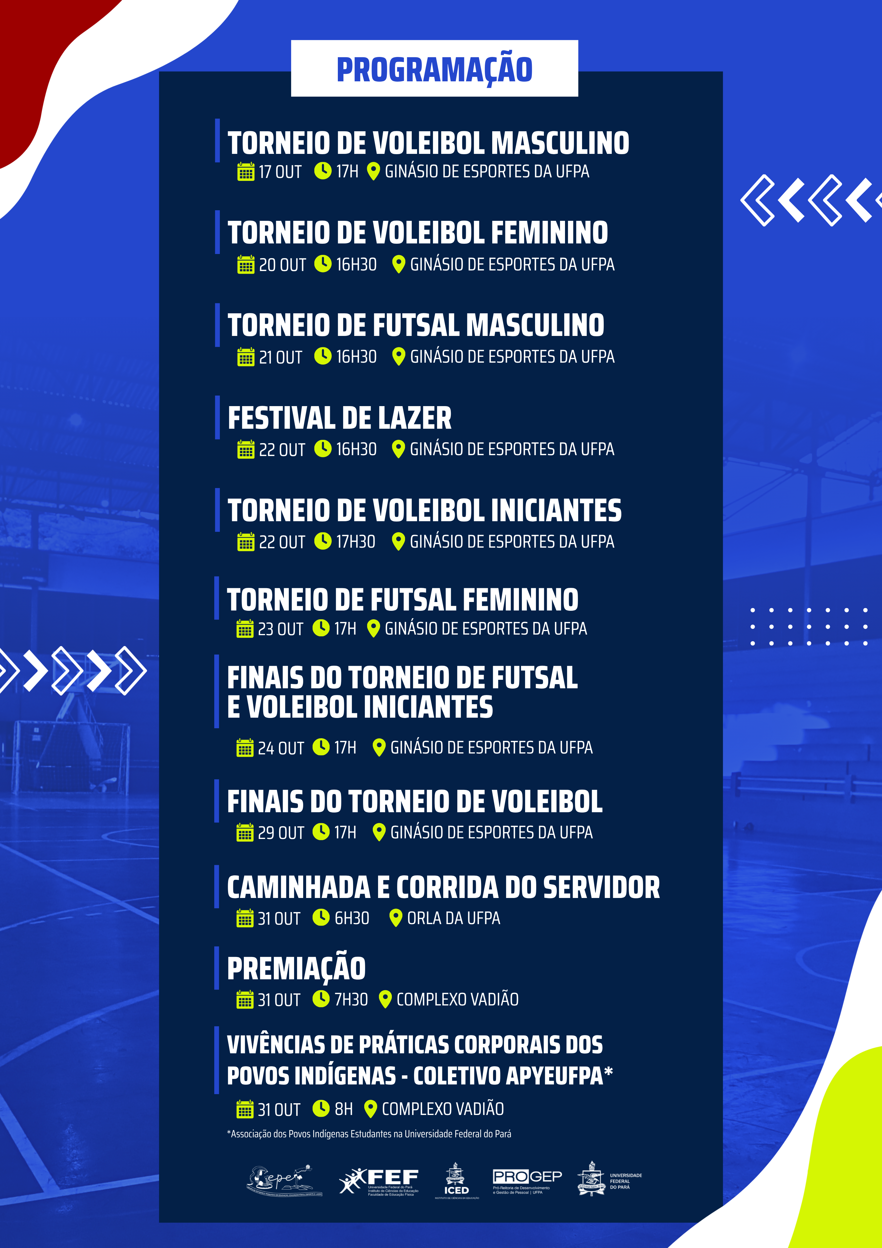 Encerramento – O encerramento será no dia 31 de outubro, às 7h30, no Complexo Vadião da UFPA, e contará com a premiação dos três primeiros colocados da Caminhada e Corrida na categoria masculina e feminina, assim como, a entrega das medalhas para os participantes do Torneio e da Caminhada e Corrida. Além disso, será realizado um momento de interação entre os servidores e a Associação dos Povos Indígenas Estudantes na Universidade Federal do Pará (APYEUFPA), através da realização de atividades de descontração, como gincanas, danças, pinturas corporais, além da venda de artesanato.