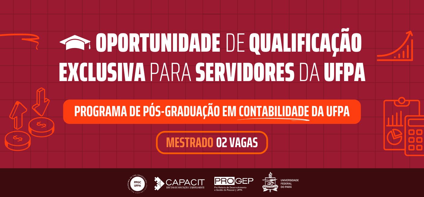 Em mais uma oportunidade do Programa de Apoio à Qualificação de Servidores Docentes e Técnico‐Administrativos, o Programa de Pós-Graduação em Contabilidade (PPGC) da UFPA está destinando 02 vagas exclusivas para servidores em sua seleção para as turmas de mestrado 2024.2, conforme disposto em edital.