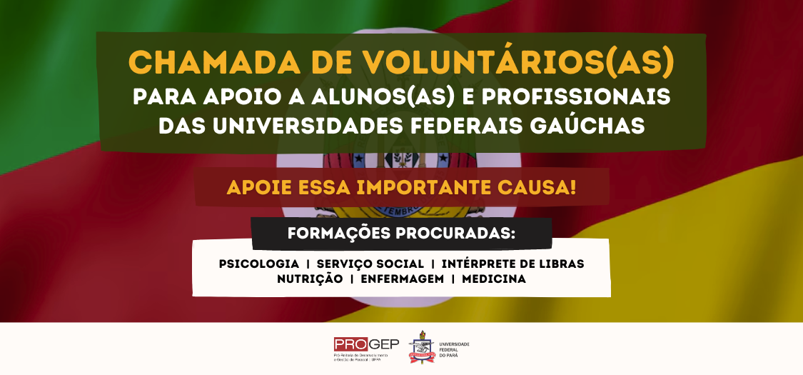 A Pró-Reitoria de Desenvolvimento e Gestão de Pessoal (Progep) da UFPA, em parceria com o Fórum Nacional de Pró-Reitores de Gestão de Pessoas (Forgepe) da Associação Nacional dos Dirigentes das Instituições Federais de Ensino Superior (Andifes), está reunindo servidores(as) docentes e técnico-administrativos(as) com formação em Psicologia, Serviço Social, Tradução e Interpretação de Libras, Nutrição, Enfermagem e Medicina para atuarem voluntariamente e de modo remoto no acolhimento e atendimento de alunos(as), servidores(as) e trabalhadores(as) terceirizados(as) das universidades federais gaúchas.