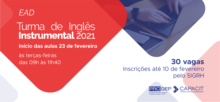 Estão abertas as inscrições para o Curso de Inglês Instrumental voltado para os servidores da Universidade Federal do Pará (UFPA). Este ano, por conta da pandemia, o curso será ofertado inteiramente na modalidade a distância, por meio da plataforma virtual do Google Classroom, com aulas síncronas (ao vivo) às terças-feiras, das 9h às 11h40.