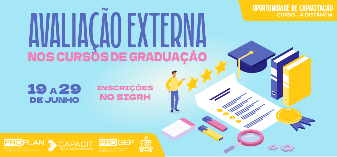 A Pró-Reitoria de Desenvolvimento e Gestão de Pessoal (PROGEP), em parceria com a Pró-Reitoria de Planejamento e Desenvolvimento Institucional-PROPLAN, está com inscrições abertas para o curso online Avaliação Externa nos Cursos de Graduação, que terá aulas ao vivo, via google meet, nos dias 19, 21, 22, 27 e 29 de junho e assíncronas nos dias 20, 23 e 26, das 14h às 17h, pelo Google Classroom.