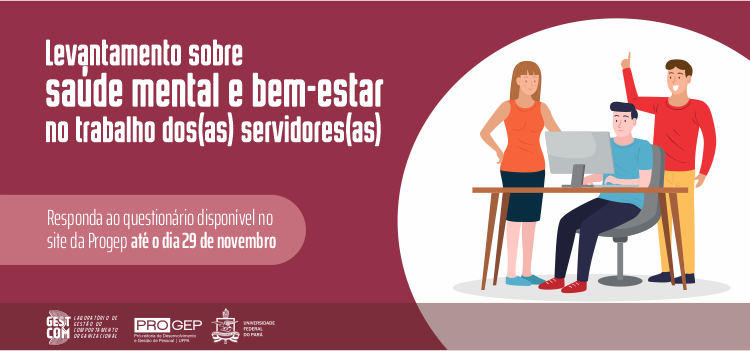 A Pró-Reitoria de Desenvolvimento e Gestão de Pessoal (Progep), em parceria com o Laboratório de Gestão do Comportamento Organizacional (Gestcom), está realizando uma pesquisa para levantamento de indicadores de saúde mental e bem-estar no trabalho relacionados aos(às) servidores(as). A consulta estará disponível para servidores, de 18 a 29 de novembro, via formulário online.