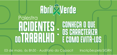 Para conscientizar a comunidade acadêmica do movimento Abril Verde, este mês, a Pró-Reitoria de Desenvolvimento e Gestão de Pessoal (Progep), por meio da Coordenadoria de Vigilância à Saúde do Servidor (CVSS), ofertará a palestra “Acidentes do Trabalho: Conheça o que os caracteriza e como evitá-los”, que ocorre no dia 3 de maio de 2018, às 8h30, no auditório do Capacit. A iniciativa tem o intuito de oportunizar um momento de reflexão sobre a real importância da segurança do trabalho e da conscientização de todos quanto ao tema, bem como estimular a adoção da prática preventiva.