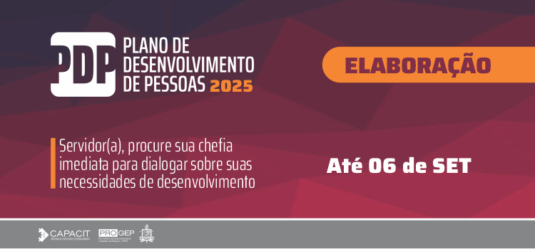 Está aberto o período para a elaboração do Plano de Desenvolvimento de Pessoas (PDP) da UFPA, para execução no ano de 2025. O prazo para registro e validação das ações de capacitação ou qualificação no sistema irá até 06 de setembro.