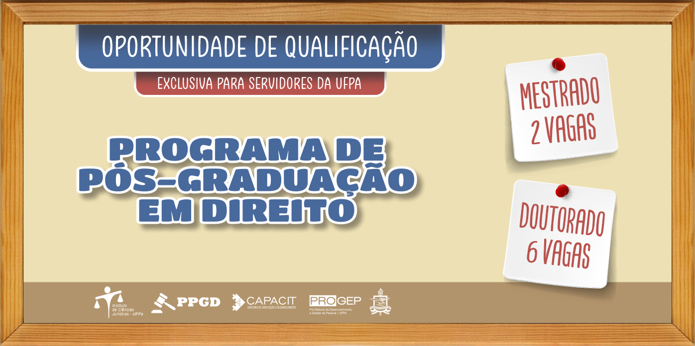 O Programa de Pós-Graduação em Direito (PPGD) da Universidade Federal do Pará abriu processo seletivo especial que destina vagas a servidores públicos efetivos da UFPA. No edital (disponível aqui) estão previstas 6 (seis) vagas para o Curso de Doutorado e 2 (duas) vagas para o curso de Mestrado, todas referentes a ingresso no segundo semestre letivo de 2023. As linhas de pesquisa do Programa são: Constitucionalismo, Políticas Públicas e Direitos Humanos; Direitos fundamentais: concretização e garantias; Direitos Fundamentais e Meio Ambiente; Estudos Críticos do Direito; Sistema Penal e Direitos Humanos.