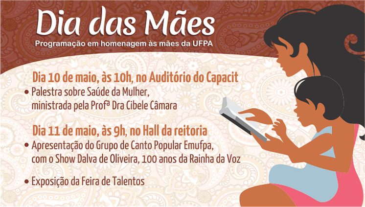 Na sexta-feira, 11, a partir das 9h, no hall da Reitoria, ocorre a apresentação do Grupo de Canto Popular, da EMUFPA, com o show especial "Dalva de Oliveira: cem anos da Rainha da Voz", homenagem a uma das mais importantes cantoras do Brasil, intérprete de sucessos como Bandeira Branca, Que Será?, Hino Ao Amor, Estrela Do Mar, entre outros. O dia também contará com uma exposição da Feira de Talentos, um café da manhã especial e brindes para as mães.