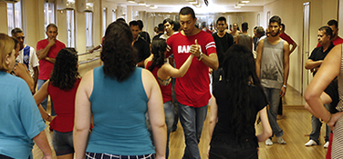 Participantes - A servidora Josyane faz aulas de dança de salão há três anos e não planeja parar: Eu já participo há três anos e nunca parei de fazer dança - só quando eu fui fazer meu TCC, mas assim que deu, eu voltei. Eu acho muito importante, porque a gente se sente mais contente, o trabalho é muito agitado, e a gente precisa desse momento de descontração. Me sinto muito bem fazendo dança.