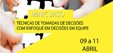 O minicurso "Técnicas de tomadas de decisões com enfoque em decisões em equipe" está com inscrições abertas. O evento terá carga horária de 12h e ocorrerá de 09 à 11 de abril, de 14hs às 18hs, no prédio Capacit (sala Tucunduba). O público-alvo são servidores técnico-administrativos e docentes da UFPA que desempenham funções gerenciais.