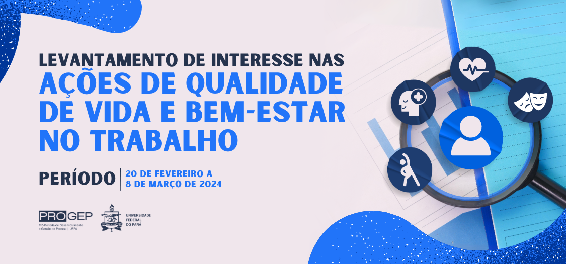 Participe do levantamento de interesse nas ações de qualidade de vida no trabalho da Progep. A pesquisa acontece de 20 de fevereiro a 08 de março, sendo direcionada a servidoras(es) de todos os campi da UFPA.