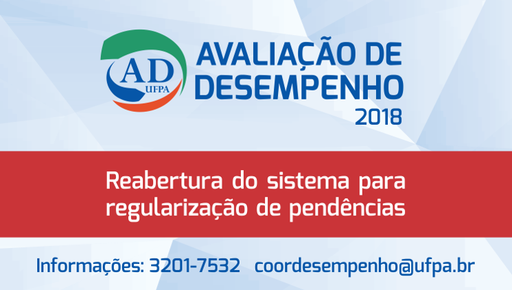 Período de regularização - Aqueles servidores e gestores que estão com pendências no Sistema de Avaliação de Desempenho podem regularizar as avaliações nos respectivos períodos: 04 a 08/06/2018 (AD 2017), 11 a 13/06/2018 (AD 2016), 14 e 15/06/2018 (AD 2015), 18 e 19/06/2018 (AD 2014), 20 e 21/06/2018 (AD 2013), e 22 a 29/06/2018 (AD de 2008 a 2012).