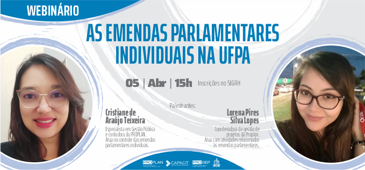 Serviço: Webinário “As Emendas Parlamentares Individuais na UFPA” Data: 05 de abril de 2023 Inscrições: Até o dia 4 de abril pelo SIGRH.