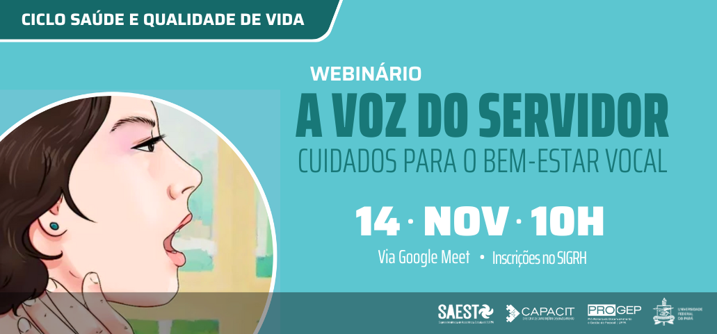 O evento faz parte do ciclo “Saúde e Qualidade de Vida”, terá carga horária de 4h e será ministrado via Google Meet, no dia 14 de novembro, das 10h às 12h, pela fonoaudióloga Bruna Cunha, que atua na Coordenadoria de Qualidade de Vida e Bem-estar no Trabalho. Ao final da palestra, os servidores deverão ser capazes de identificar abusos vocais, realizar hábitos saudáveis para a voz e reconhecer suas próprias alterações vocais.