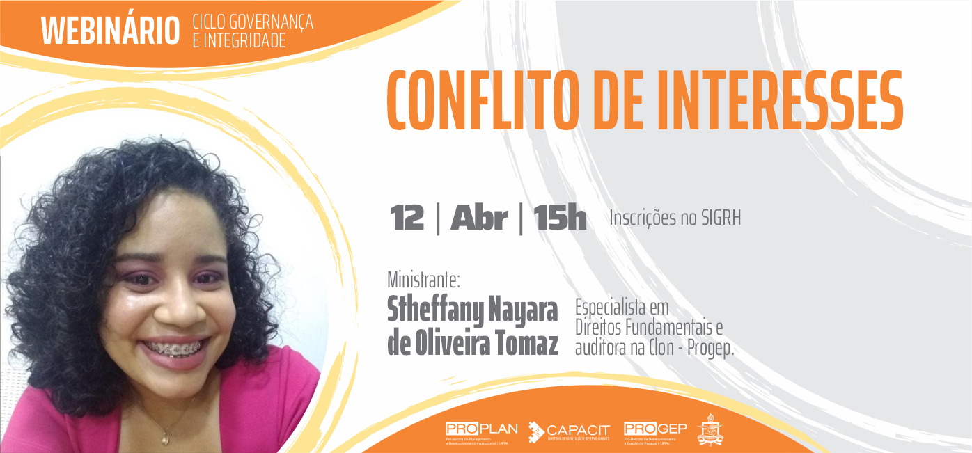 No primeiro webinário do ciclo o tema abordado será Conflito de Interesses. O evento será realizado no dia 12 de abril, das 15h às 17h, via Google Meet. O objetivo do evento é apresentar orientações gerais aos servidores da UFPA sobre a temática, uma vez que todos os agentes públicos estão sujeitos à Lei de Conflito de Interesses, que se aplica quando temos uma situação que gera confronto entre interesses públicos e privados, comprometendo o interesse coletivo ou influenciando, de maneira imprópria, o desempenho da função pública.